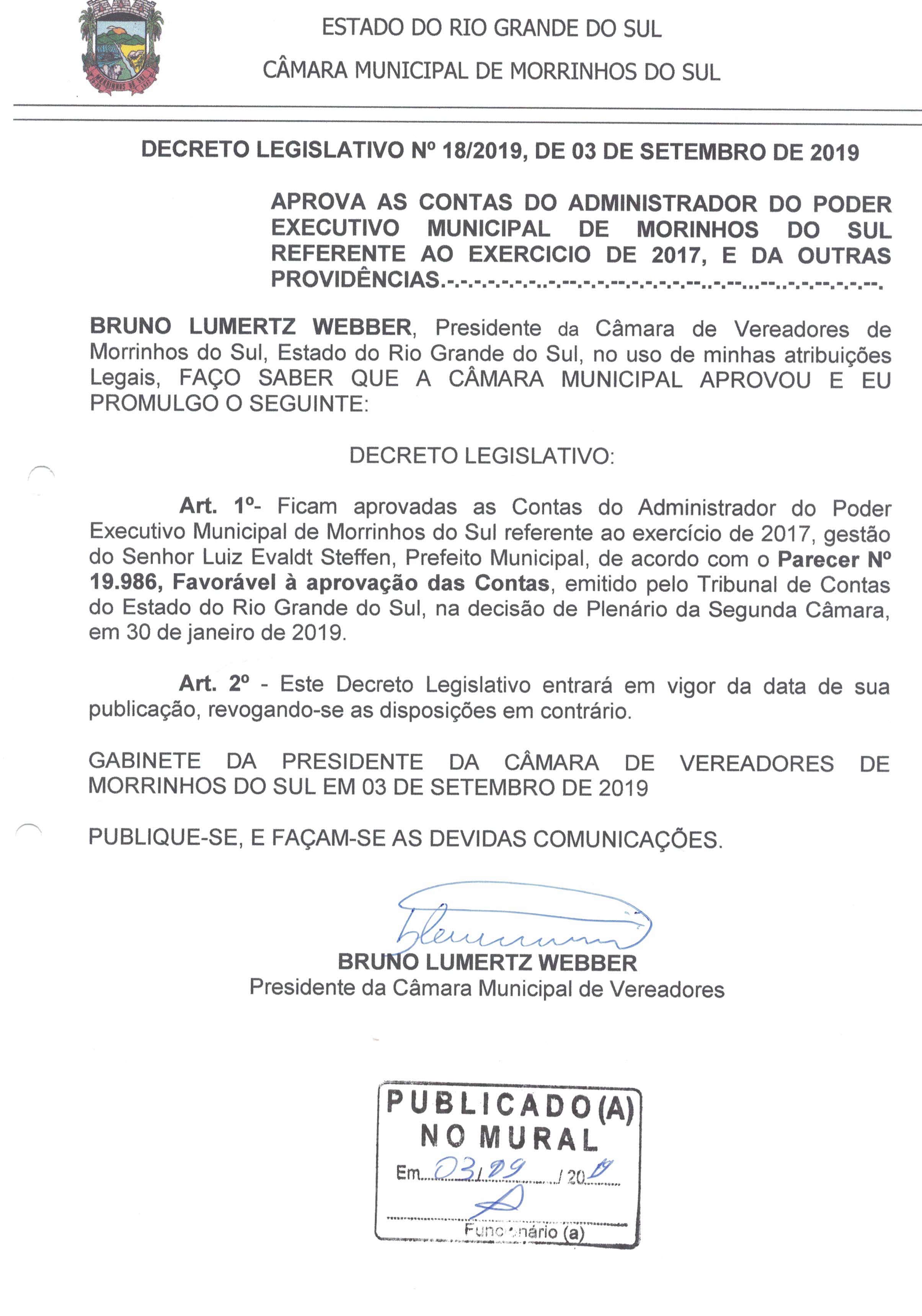 DECRETO LEGISLATIVO Nº 18/2019- Contas exercício de 2017.